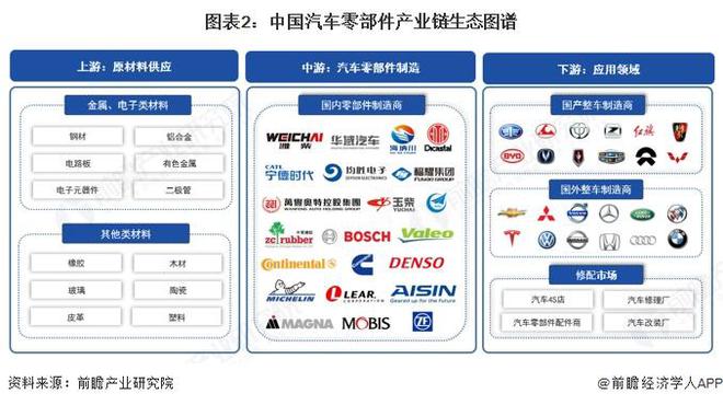 汽车零部件制造业的上下游产业主要是指其相关的供应和需求产业。汽车零部件制造业产业链上游主要包括提供原材料的市场,包括钢铁、有色金属、电子元器件、塑料、橡胶、木材、玻璃、陶瓷、皮革等。中游汽车零部件种类样式丰富,其中发动机组和电子控制系统属于汽车核心零部件。下游包括汽车整车制造厂商、汽车4S店、汽车修理厂、汽车零部件配件商和汽车改装厂等。