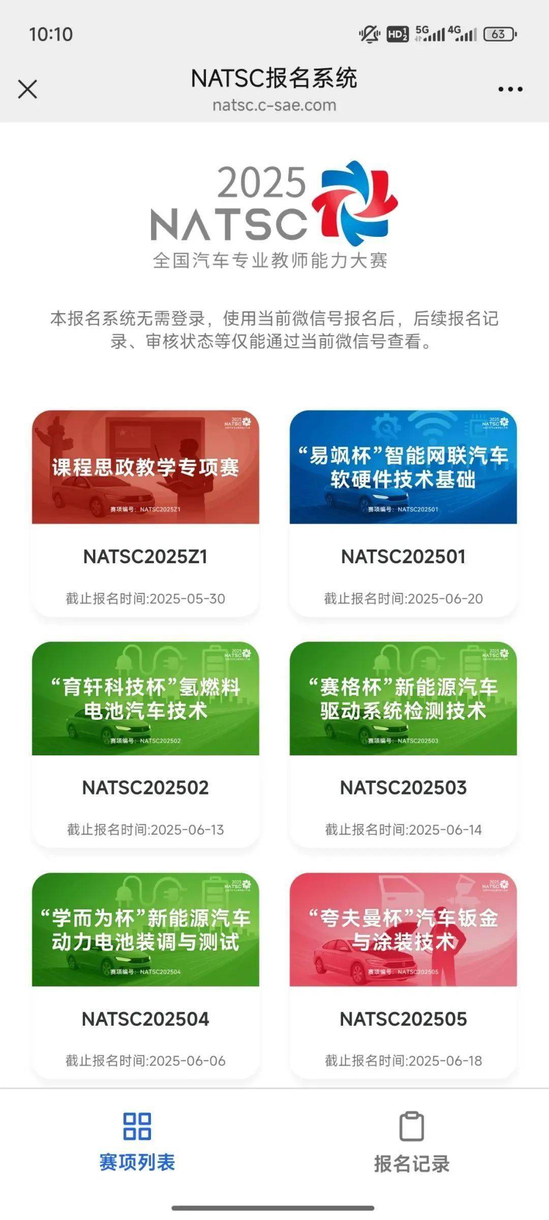 首先需关注大赛官方平台“汽车职业教育”微信公众号,进入公众号后,在菜单栏查找“NATSC”(不是在对话框回复),进入“参赛报名系统”,选择相应赛项进入填写报名信息。