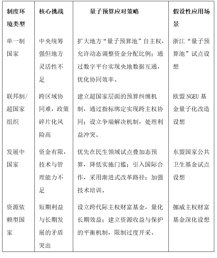 不同的制度环境对量子预算的应用提出了差异化的要求。为清晰呈现量子预算在各类制度环境中的适应性策略(见表3)。通过对中外假设性场景的系统推演,量子预算理论展现出三方面核心价值。在技术层面,依托数字平台与智能算法构建的量子预算模型,有望实现资源的动态响应与精准调配,显著提升资金使用效率,为财政管理注入科技动能;在制度层面,通过引入叠加态、纠缠系数等创新概念重构资金分配机制,或能有效破解跨区域协同、代际公平等传统治理难题,推动制度创新与治理能力现代化;在价值层面,量子预算推动预算决策从单一经济导向转向多元目标共生,促进经济、社会与生态效益的平衡,重构公共资源配置的价值体系,助力实现可持续发展目标。